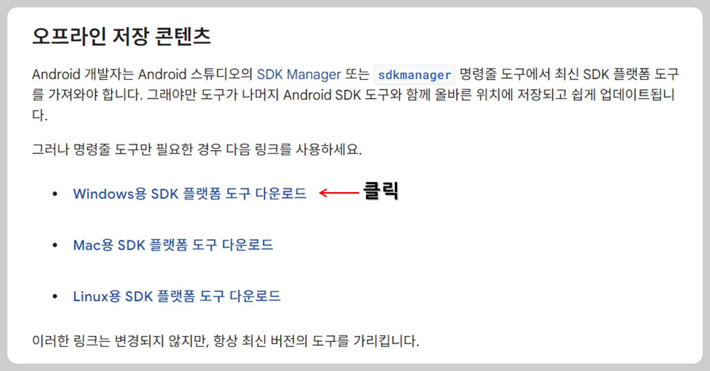 저는 Windows 사용자이니 Windows용 SDK 플랫폼 도구 다운로드를 해주었습니다.