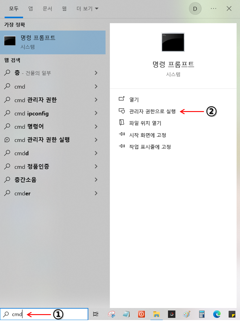 cmd를 입력하면 위와 같이 그림이 뜨게되는데 해당 부분에서 관리자 권한으로 실행을 눌러줍니다.