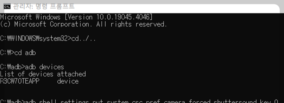 → 마지막에 입력한 명령어에서 "0"을 "1"로 바꾸어 설정해주시면 다시 카메라 셔터 소리 복구가능합니다.