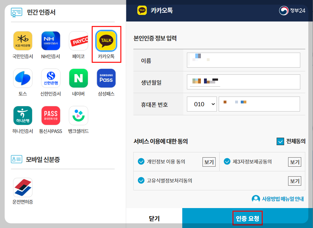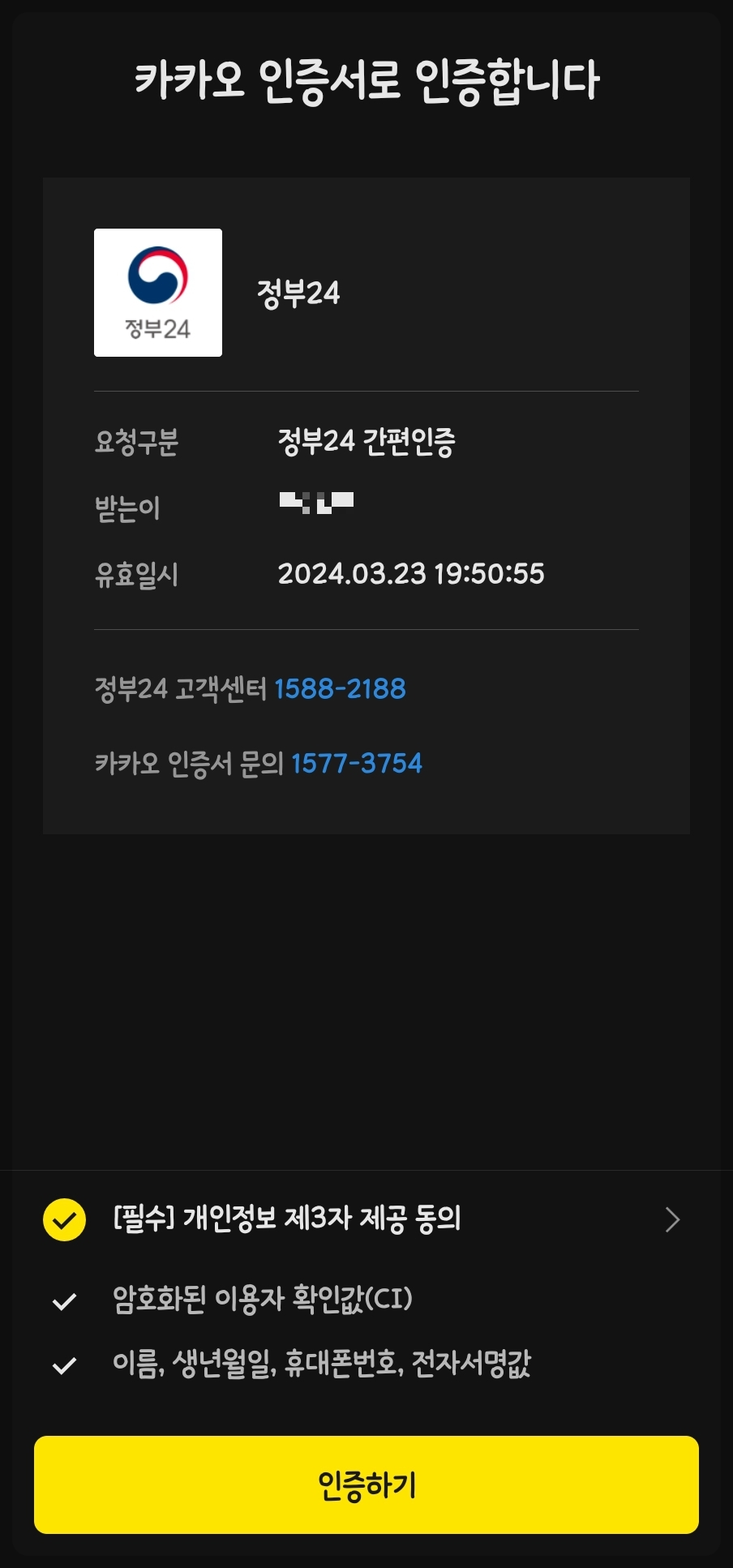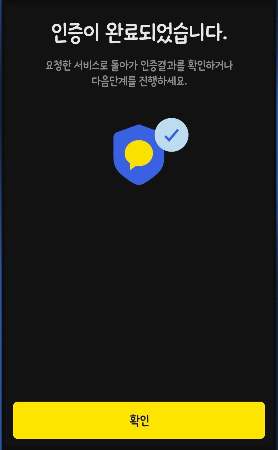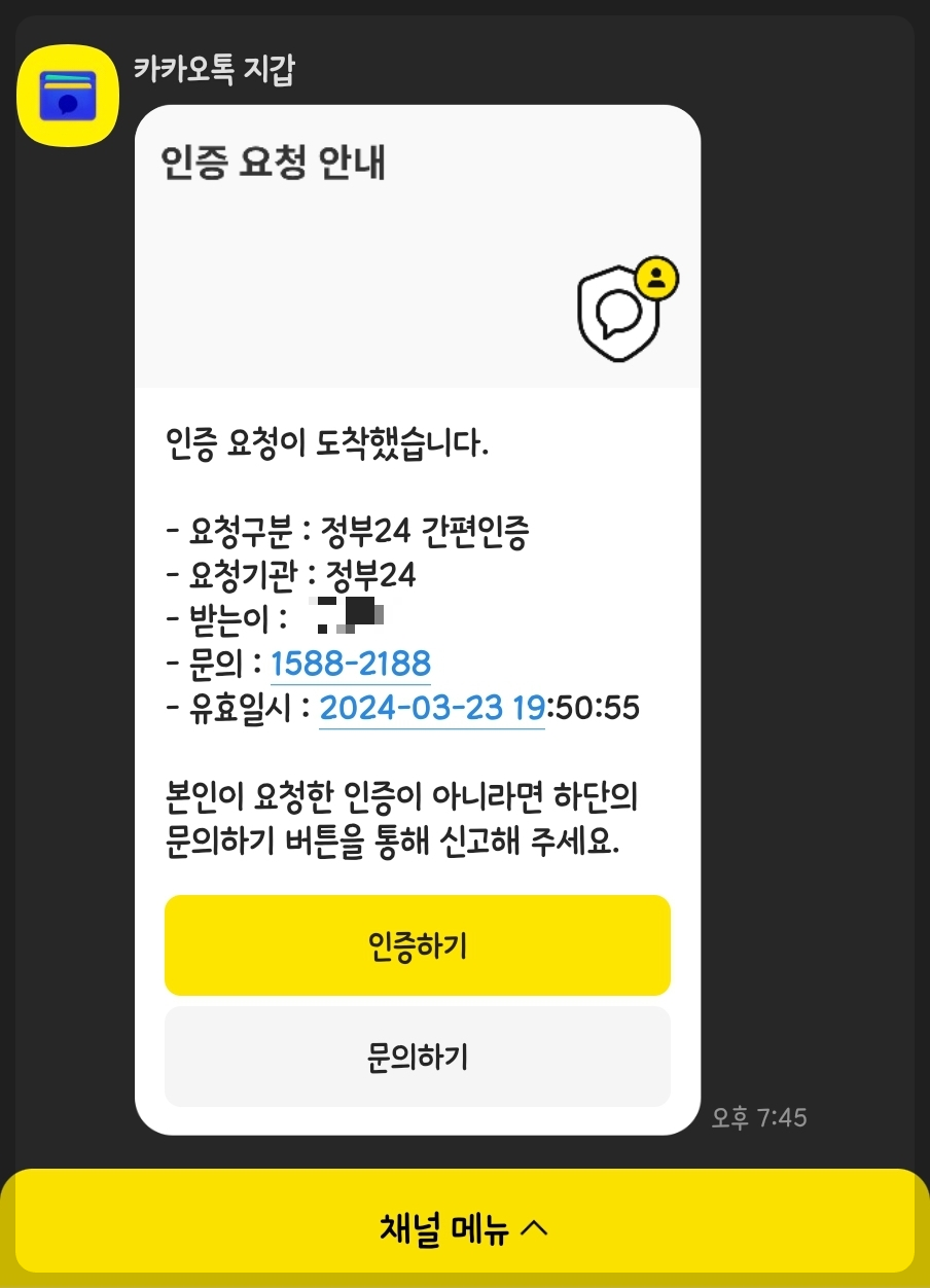인증요청을 눌러주면 카카오톡으로 인증카톡