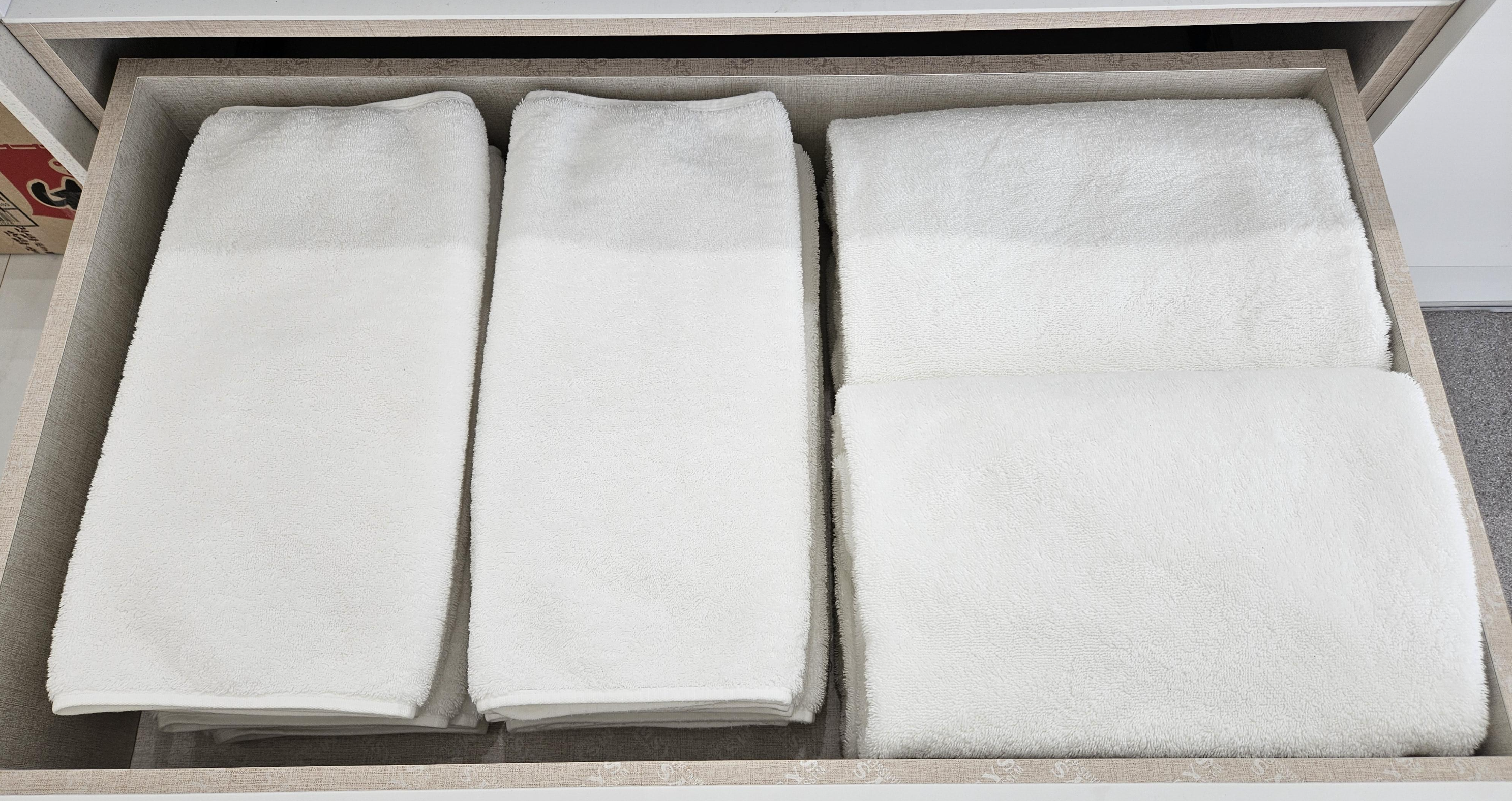 서랍장에는 수건, 드라이기, 면봉, 빗